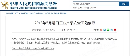 中國質(zhì)量新聞網(wǎng)訊 2018年6月20日,海關(guān)總署官網(wǎng)發(fā)布2018年5月進(jìn)口工業(yè)產(chǎn)品安全風(fēng)險信息,16批進(jìn)口工業(yè)產(chǎn)品存安全風(fēng)險,涉及服裝、衛(wèi)生紙、票據(jù)打印機(jī)、越野車、點(diǎn)火開關(guān)等多個品類。所列批次產(chǎn)品的問題是入境口岸海關(guān)實(shí)施檢驗(yàn)檢疫時發(fā)現(xiàn)的,都已依法做退貨、銷毀處理。這些存在安全風(fēng)險的產(chǎn)品未在國內(nèi)市場銷售。