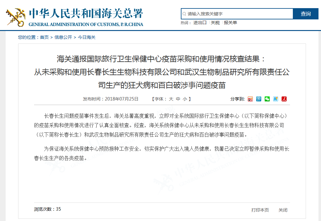為保證海關(guān)系統(tǒng)保健中心預(yù)防接種工作安全,切實(shí)保護(hù)廣大出入境人員健康,海關(guān)總署已決定立即暫停采購(gòu)和使用長(zhǎng)春長(zhǎng)生生產(chǎn)的各類疫苗。