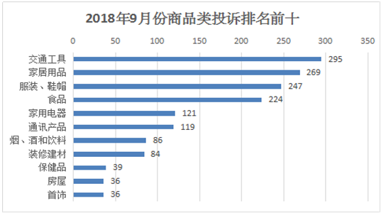 2018年9月份,山西省1865件商品類投訴中,熱點排名前三依次為交通工具類、家居用品類、服裝鞋帽類。詳見下圖: