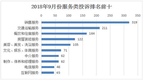 2018年9月份,山西省各級12315機(jī)構(gòu)共受理1951件服務(wù)類投訴,數(shù)量排名前三的依次為銷售服務(wù)類、交通運輸服務(wù)類、餐飲和住宿服務(wù)類。