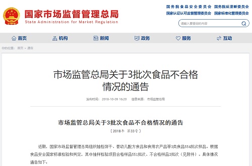 中國質(zhì)量新聞網(wǎng)訊 10月9日,國家市場(chǎng)監(jiān)督管理總局官網(wǎng)發(fā)布通告稱,近期,國家市場(chǎng)監(jiān)督管理總局組織抽檢餅干、嬰幼兒配方食品和食用農(nóng)產(chǎn)品等3類食品554批次樣品。根據(jù)食品安全國家標(biāo)準(zhǔn)檢驗(yàn)和判定,其中抽樣檢驗(yàn)項(xiàng)目合格樣品551批次、不合格樣品3批次。
