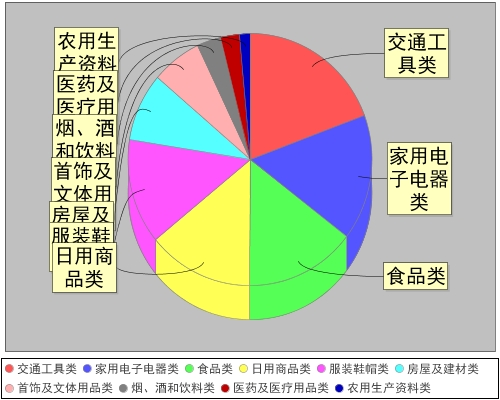 表1?按投訴問題性質(zhì)分類情況表 ???(二)商品投訴分析 ?根據(jù)商品投訴分析(如圖二所示),交通工具類279件,占10.65%;家用電子電器類233件,占8.90%;食品類212件,占8.09%;日用商品類203件,占7.75%;服裝鞋帽類195件,占7.45%;房屋及建材類127件,占4.85%;首飾及文體用品類96件,占3.67%;煙、酒和飲料類46件,占1.76%;醫(yī)藥及醫(yī)療用品類36件,占1.37%;農(nóng)用生產(chǎn)資料類20件,占0.76%;其中,交通工具類、家用電子電器類、食品類、日用商品類、服裝鞋帽類占據(jù)了消費(fèi)者投訴的前5名。