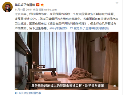 其實(shí),早在2017年,藍(lán)莓評(píng)測就發(fā)布過5家頂級(jí)五星酒店客房存在衛(wèi)生亂象,如不換床單、不洗浴缸、不擦馬桶、不洗漱口杯等。“這不是第一次,也不會(huì)是最后一次!”每一次曝光都觸動(dòng)著消費(fèi)者敏感的神經(jīng),“杯子的秘密”引發(fā)公眾強(qiáng)烈憤慨。