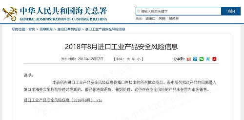 2018年8月進(jìn)口工業(yè)產(chǎn)品安全風(fēng)險信息