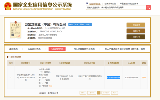 不僅如此,中國質(zhì)量新聞網(wǎng)注意到,萬寶龍還存在違規(guī)宣傳的行為。國家企業(yè)信用信息公示系統(tǒng)顯示,2017年6月19日,萬寶龍商業(yè)(中國)有限公司因通過微信公眾號及微博發(fā)布的萬寶龍商品廣告涉及頂級腕表等廣告內(nèi)容違反了《中華人民共和國廣告法》第九條第(三)款“廣告不得使用‘國家級’、‘最高級’、‘最佳’等用語”的規(guī)定被上海市工商行政管理局機(jī)場分局罰款300000.0 元。