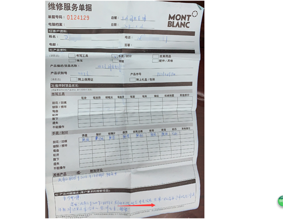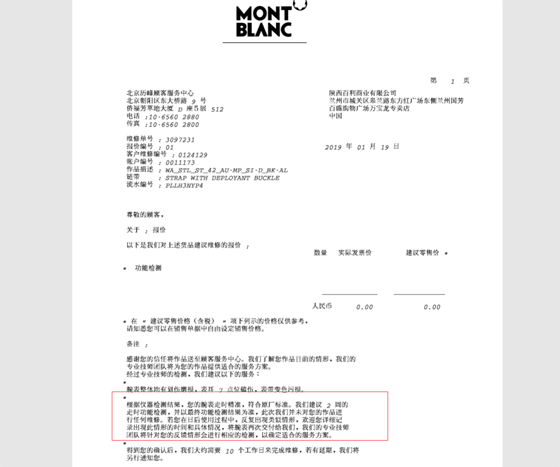 李先生說,2019年1月手表送到店里時,工作人員對手表外觀進(jìn)行了初步檢查,并開據(jù)了一份修理單,寫明“手表出現(xiàn)機(jī)芯停走”,希望萬寶龍維修部同事給予具體檢測。但2019年2月,去專賣店取手表時,萬寶龍出具的維修報告單上寫著,根據(jù)儀器檢測結(jié)果,腕表走時精準(zhǔn),符合原廠標(biāo)準(zhǔn)。此次我們并未對您的作品進(jìn)行任何維修。