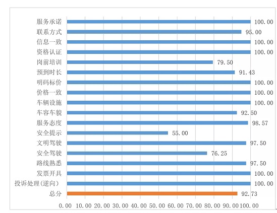出租車16項測評指標(biāo)中,“投訴渠道”等9項指標(biāo)滿分;得分較低的是“司機(jī)信息”(78.57分)、“車輛設(shè)施”(78.57分)、“安全駕駛”(85.71分),最低的“安全提示”僅有30分。