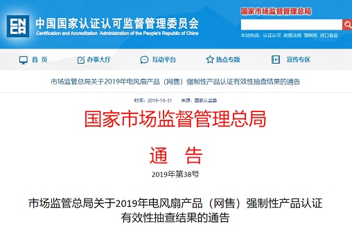 中國質量新聞網訊 據國家認證認可監(jiān)督管理委員會網站2019年10月31日消息,近日,國家市場監(jiān)督管理總局發(fā)布《市場監(jiān)管總局關于2019年電風扇產品(網售)強制性產品認證有效性抽查結果的通告》,對19批次不合格產品作出撤銷強制性產品認證證書的處理。
