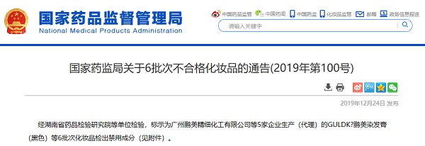 中國質(zhì)量新聞網(wǎng)訊? 2019年12月24日,國家藥品監(jiān)督管理局發(fā)布的《關(guān)于6批次不合格化妝品的通告(2019年第100號(hào))》顯示,經(jīng)湖南省藥品檢驗(yàn)研究院等單位檢驗(yàn)發(fā)現(xiàn),6批次化妝品質(zhì)量不合格。