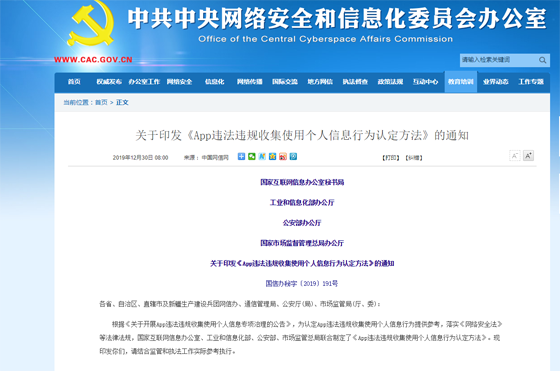中國質量新聞網訊 2019年12月30日,國家互聯網信息辦公室、工業(yè)和信息化部、公安部、市場監(jiān)管總局聯合發(fā)布《App違法違規(guī)收集使用個人信息行為認定方法》(以下簡稱“方法”)。