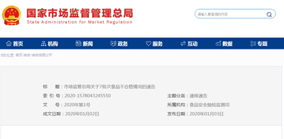 中國質(zhì)量新聞網(wǎng)訊? ?2020年1月3日,市場監(jiān)管總局官網(wǎng)發(fā)布關(guān)于7批次食品不合格情況的通告。通告稱,近期,市場監(jiān)管總局組織食品安全監(jiān)督抽檢,抽取肉制品、食用農(nóng)產(chǎn)品、糕點、茶葉及相關(guān)制品、蛋制品、罐頭、酒類、冷凍飲品、糧食加工品、乳制品、蔬菜制品、水產(chǎn)制品、水果制品、速凍食品、糖果制品、飲料、豆制品、淀粉及淀粉制品和食用油、油脂及其制品等19大類食品365批次樣品(產(chǎn)品抽檢結(jié)果可查詢https://sac.nifdc.org.cn/),發(fā)現(xiàn)肉制品、食用農(nóng)產(chǎn)品、糕點3大類食品7批次樣品不合格,檢出微生物污染、農(nóng)獸藥殘留超標、食品添加劑超限量使用、質(zhì)量指標不達標等問題。
