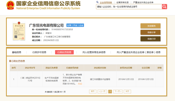 事實上,這并非廣東恒光電器有限公司首次出現(xiàn)產(chǎn)品質(zhì)量問題。