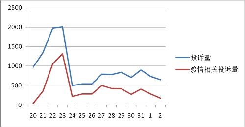 圖1:總投訴及疫情相關(guān)投訴數(shù)據(jù)圖(1.20-2.2)