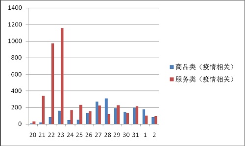 圖3:疫情相關(guān)商品類與服務(wù)類投訴量對比圖(1.21-2.2)