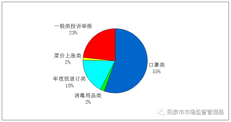 ??? 2020年春節(jié)期間,市12315中心共受理疫情相關投訴舉報共計765件,占春節(jié)期間投訴舉報受理總量的56%。其中口罩類投訴舉報417件,占疫情相關受理總量的55%,占春節(jié)期間受理總量的31%;消毒用品類投訴舉報14件,占疫情相關受理總量的1.8%,占春節(jié)期間受理總量的1%;年夜飯退訂類投訴舉報135件,占疫情相關受理總量的17.6%,占春節(jié)期間受理總量的10%;菜價上漲類投訴舉報22件,占疫情相關受理總量的1.9%,占春節(jié)期間受理總量的1.6%。如下圖: