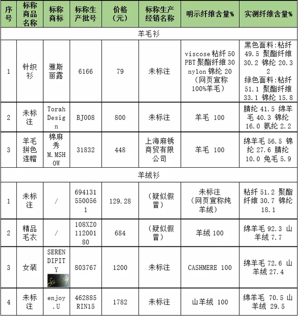 1、纖維成分及含量:7件樣品實(shí)測(cè)與其宣稱不一致,其中時(shí)尚小店有問(wèn)題的比例高,價(jià)格最低的2件樣品均不含羊毛或羊絨成分。