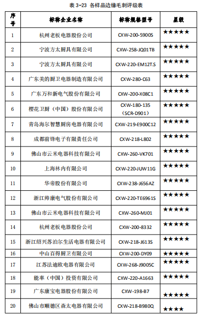 結(jié)果顯示,有1組樣品的風(fēng)道邊緣處有毛刺,剩下19組樣品的進(jìn)風(fēng)口柵格內(nèi)表面、油杯或油槽卡扣、風(fēng)輪邊緣、風(fēng)道邊緣、裝飾罩金屬邊緣未發(fā)現(xiàn)銳利的棱邊,評級標(biāo)準(zhǔn)及各吸油煙機(jī)評級表詳見3-22、3-23。