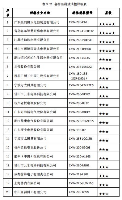 結(jié)果顯示,20組樣品中有6組樣品容易清潔,剩余14組樣品較容易清潔,評級標(biāo)準(zhǔn)及各吸油煙機(jī)評級表詳見3-20、3-21。