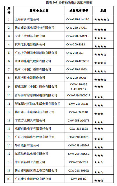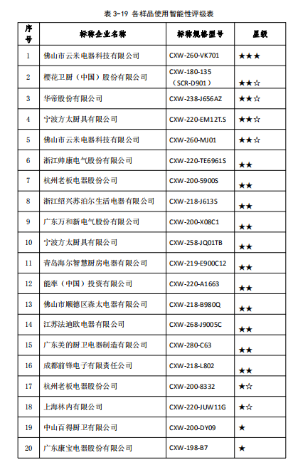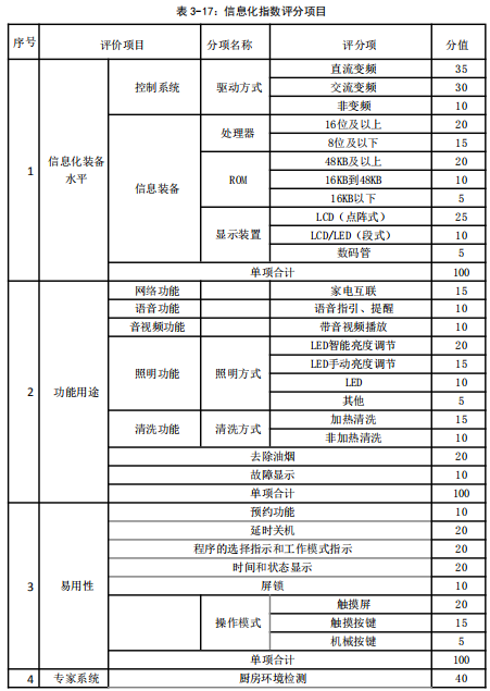 結(jié)果顯示,20組樣品中信息化指數(shù)最高為54.50分,最低為16.00分,評級標(biāo)準(zhǔn)及各吸油煙機(jī)評級表詳見3-18、3-19。