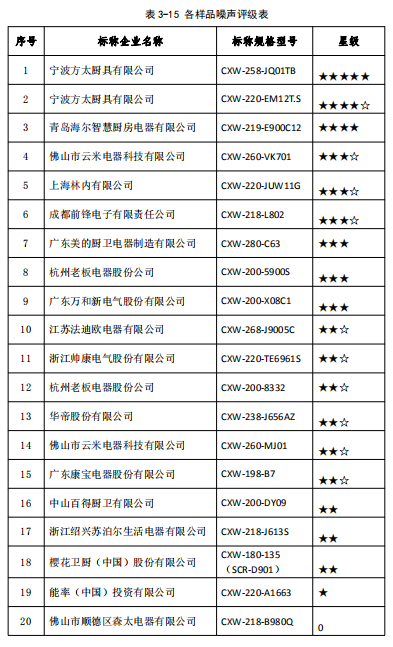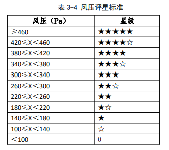 結(jié)果顯示,20組樣品的風(fēng)壓均大于100Pa,風(fēng)壓最高達(dá)611.8Pa,最低為182.6Pa,其中有10組吸油煙機(jī)的風(fēng)壓大于等于340Pa,評級標(biāo)準(zhǔn)、各吸油煙機(jī)評級表詳見3-4、3-5。