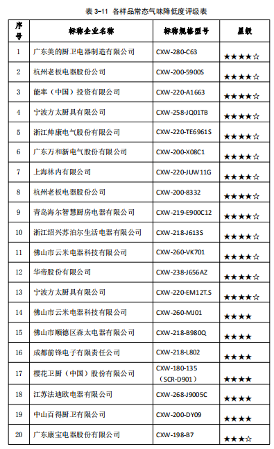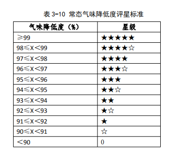 結(jié)果顯示,20組樣品的常態(tài)氣味降低度均大于95%,常態(tài)氣味降低度最高達(dá)98.8%,最低為96.8%,評級標(biāo)準(zhǔn)及各吸油煙機(jī)評級表詳見3-10、3-11。