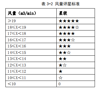 結(jié)果顯示,20組樣品的風(fēng)量均大于10 m3/min,風(fēng)量最高達(dá)20.7m3/min,最低為11.6m3/min,其中有7組吸油煙機(jī)的風(fēng)量大于等于18 m3/min,評級標(biāo)準(zhǔn)及各吸油煙機(jī)評級表詳見3-2、3-3。