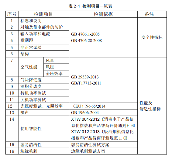 根據(jù)消費(fèi)者的關(guān)注熱點(diǎn),分別從安全性和性能舒適性兩方面進(jìn)行檢測;并依據(jù)創(chuàng)新的試驗(yàn)方法對吸油煙機(jī)使用智能性進(jìn)行了評測,詳見表2-1檢測項(xiàng)目一覽表。