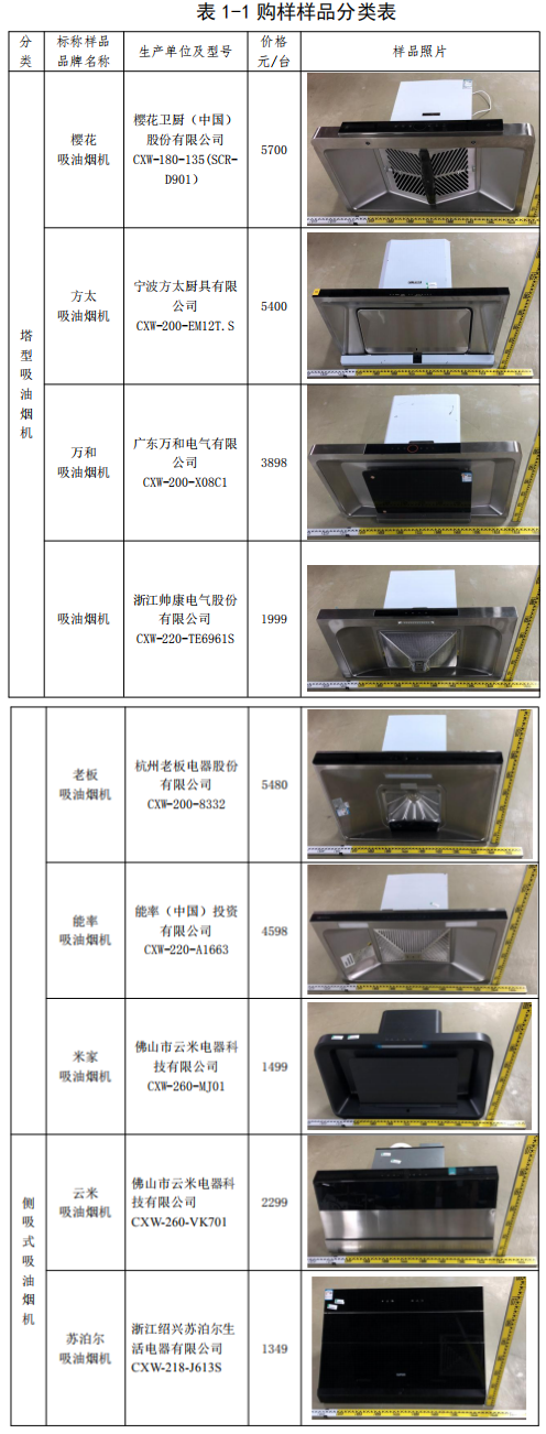 省消委會根據(jù)《中國消費(fèi)者協(xié)會比較試驗(yàn)工作規(guī)則》等要求,2019年10月,邀請消費(fèi)者代表一起模擬消費(fèi)者消費(fèi)行為,在成都市各大商超以及京東商城、天貓商城、蘇寧易購、國美在線等網(wǎng)購平臺購買了20組品牌樣品,其中有7組塔型吸油煙機(jī)、11組側(cè)吸式吸油煙機(jī)、2組深型吸油煙機(jī),詳見表1-1購樣樣品分類表。