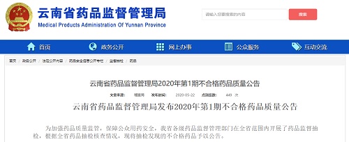 中國(guó)質(zhì)量新聞網(wǎng)訊 2020年5月22日,云南省藥品監(jiān)督管理局網(wǎng)站發(fā)布2020年第1期不合格藥品質(zhì)量公告。