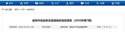中國質(zhì)量新聞網(wǎng)訊 2020年5月29日,威海市市場(chǎng)監(jiān)督管理局網(wǎng)站發(fā)布威海市食品安全監(jiān)督抽檢信息通告(2020年第7期)。據(jù)通告,近期,威海市市場(chǎng)監(jiān)督管理局組織餐飲服務(wù)環(huán)節(jié)抽檢,共抽檢食品、食用農(nóng)產(chǎn)品188批次,不合格1批次。根據(jù)食品安全國家標(biāo)準(zhǔn),個(gè)別項(xiàng)目不合格,其產(chǎn)品即判定為不合格產(chǎn)品。