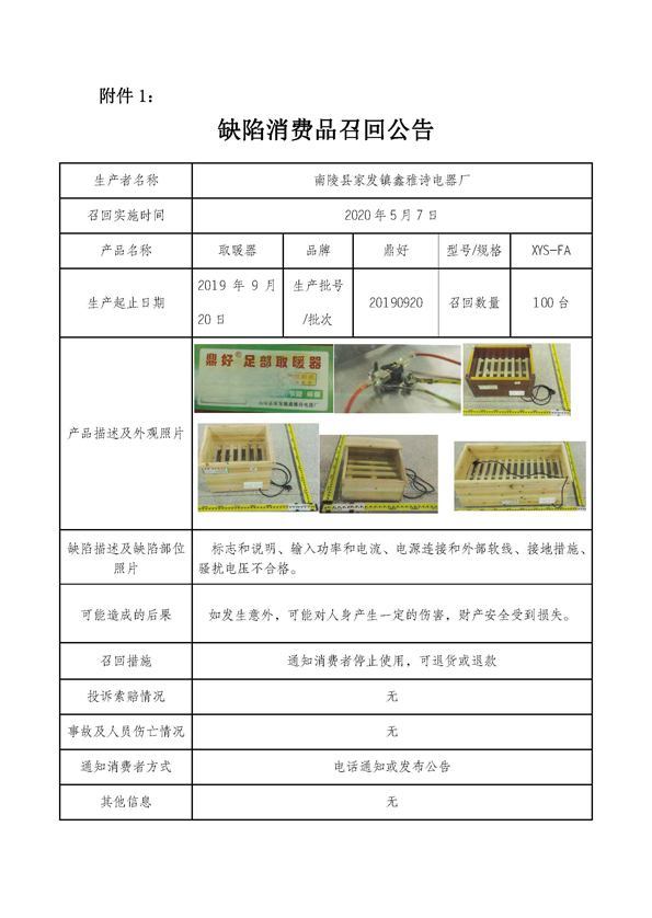 中國質(zhì)量新聞網(wǎng)訊 據(jù)安徽省缺陷產(chǎn)品召回管理技術(shù)中心網(wǎng)站2020年5月29日消息,日前,南陵縣家發(fā)鎮(zhèn)鑫雅詩電器廠向安徽省市場監(jiān)督管理局、蕪湖市市場監(jiān)督管理局備案了召回計劃,決定自 2020年 5月7日起召回 2019年9月20日生產(chǎn)的該批次XYS-FA型號的取暖器,受影響的產(chǎn)品數(shù)量為100臺。
