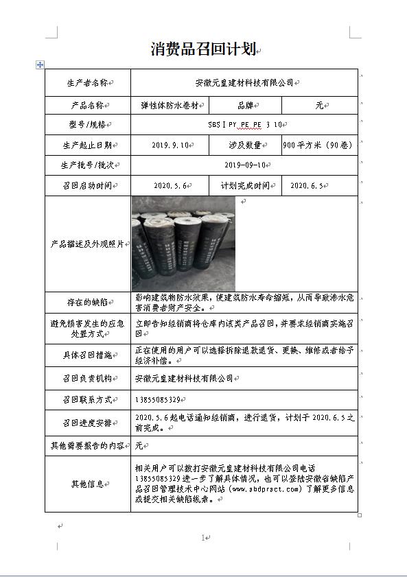 中國(guó)質(zhì)量新聞網(wǎng)訊 據(jù)安徽省缺陷產(chǎn)品召回管理技術(shù)中心網(wǎng)站2020年5月29日消息,日前,安徽元皇建材科技有限公司按照《消費(fèi)品召回管理暫行規(guī)定》的要求,主動(dòng)向安徽省市場(chǎng)監(jiān)督管理局報(bào)告了召回計(jì)劃,將自即日起,召回2019年9月10日生產(chǎn)的彈性體改性瀝青防水卷材, 涉及數(shù)量為900平方米(90卷)。