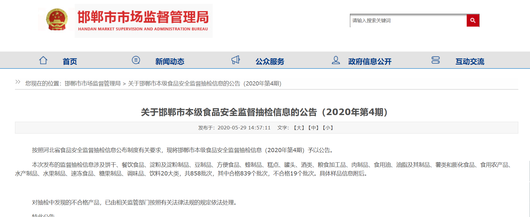 中國(guó)質(zhì)量新聞網(wǎng)訊 5月29日,邯鄲市市場(chǎng)監(jiān)督管理局官網(wǎng)發(fā)布2020年第4期食品安全監(jiān)督抽檢信息。本次發(fā)布的監(jiān)督抽檢信息涉及餅干、餐飲食品、淀粉及淀粉制品、豆制品、方便食品、蜂制品、糕點(diǎn)、罐頭、酒類(lèi)、糧食加工品、肉制品、食用油、油脂及其制品、薯類(lèi)和膨化食品、食用農(nóng)產(chǎn)品、水產(chǎn)制品、水果制品、速凍食品、糖果制品、調(diào)味品、飲料20大類(lèi),共858批次,其中合格839個(gè)批次,不合格19個(gè)批次。
