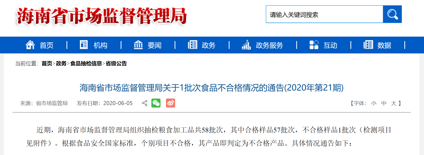 中國質(zhì)量新聞網(wǎng)訊 6月5日,海南省市場監(jiān)督管理局官網(wǎng)發(fā)布關于1批次食品不合格情況的通告。通告稱,近期,海南省市場監(jiān)督管理局組織抽檢糧食加工品共58批次,其中合格樣品57批次,不合格樣品1批次。根據(jù)食品安全國家標準,個別項目不合格,其產(chǎn)品即判定為不合格產(chǎn)品。具體情況通告如下: