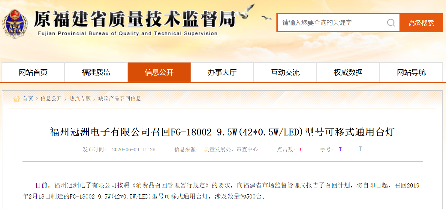 中國質(zhì)量新聞網(wǎng)訊 從原福建省質(zhì)監(jiān)局網(wǎng)站獲悉,日前,福州冠洲電子有限公司按照《消費品召回管理暫行規(guī)定》的要求,向福建省市場監(jiān)督管理局報告了召回計劃,將自即日起,召回2019年2月18日制造的FG-18002 9.5W(42*0.5W/LED)型號可移式通用臺燈,涉及數(shù)量為500臺。