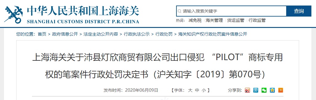 中國質(zhì)量新聞網(wǎng)訊 2020年6月9日,上海海關(guān)網(wǎng)站發(fā)布《上海海關(guān)關(guān)于沛縣燈欣商貿(mào)有限公司出口侵犯 “PILOT”商標(biāo)專用權(quán)的筆案件行政處罰決定書(滬關(guān)知字〔2019〕第070號)》。