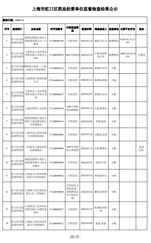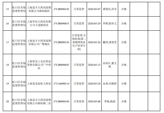 上海市虹口區(qū)藥品經(jīng)營(yíng)單位監(jiān)督檢查結(jié)果公示