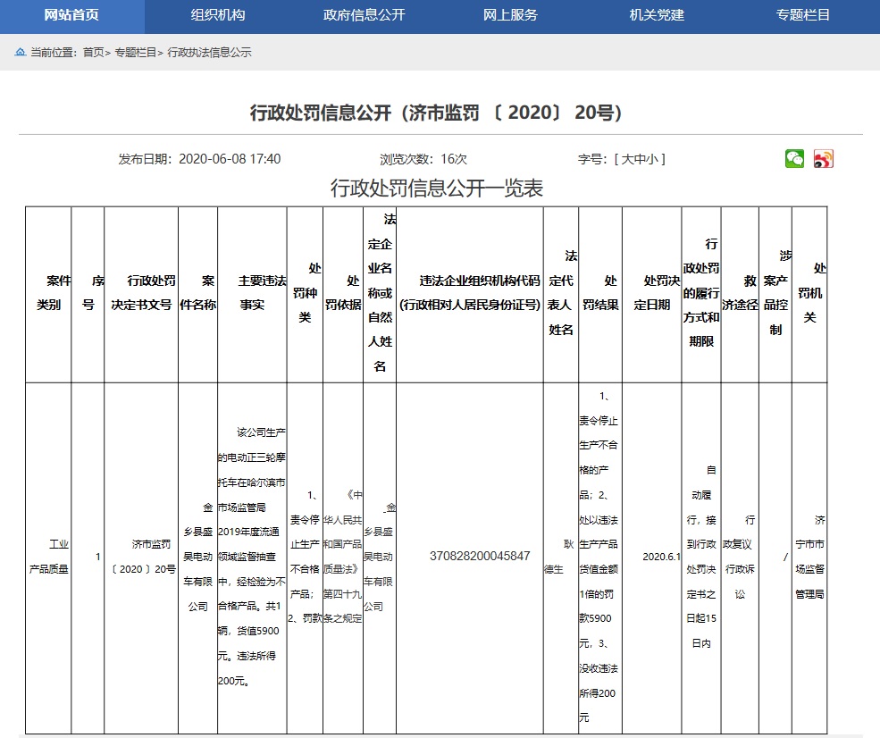 信息顯示,金鄉(xiāng)縣盛昊電動(dòng)車有限公司生產(chǎn)的電動(dòng)正三輪摩托車在哈爾濱市市場監(jiān)管局2019年度流通領(lǐng)域監(jiān)督抽查中,經(jīng)檢驗(yàn)為不合格產(chǎn)品。共1輛,貨值5900元。違法所得200元。依據(jù)《中華人民共和國產(chǎn)品質(zhì)量法》第四十九條之規(guī)定,濟(jì)寧市市場監(jiān)督管理局責(zé)令停止生產(chǎn)不合格的產(chǎn)品,處以違法生產(chǎn)產(chǎn)品貨值金額1倍的罰款5900元,沒收違法所得200元。