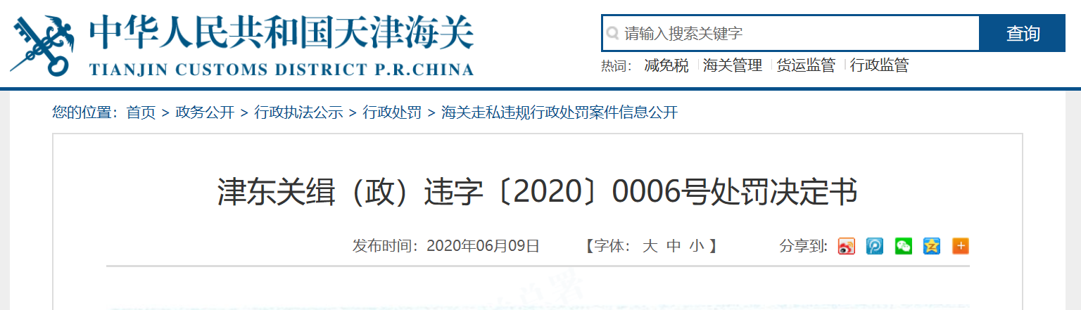 中國(guó)質(zhì)量新聞網(wǎng)訊 6月9日,天津海關(guān)官網(wǎng)發(fā)布津東關(guān)緝(政)違字〔2020〕0006號(hào)處罰決定書。