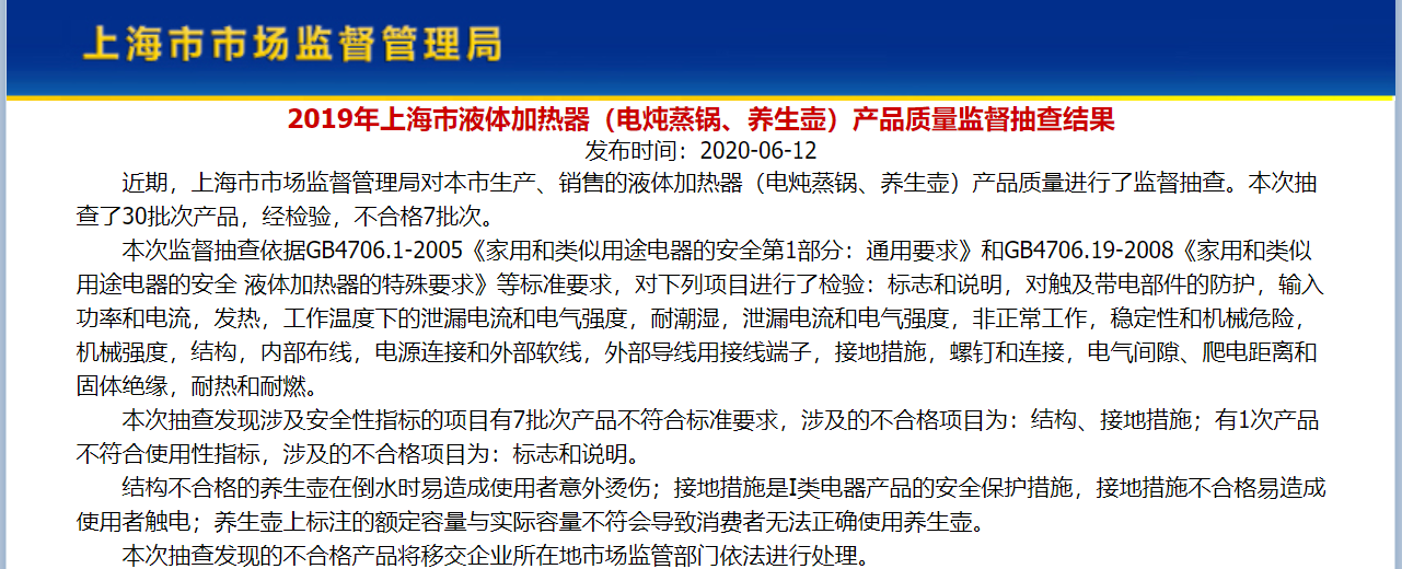 2019年上海市養(yǎng)生壺產(chǎn)品質(zhì)量監(jiān)督抽查不合格產(chǎn)品