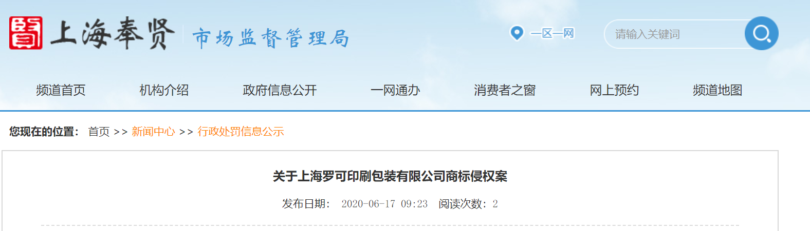 中國質(zhì)量新聞網(wǎng)訊 6月17日,上海市奉賢區(qū)市場監(jiān)督管理局官網(wǎng)發(fā)布行政處罰信息。