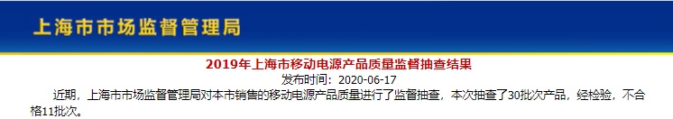 中國質(zhì)量新聞網(wǎng)訊 2020年6月17日,上海市市場監(jiān)督管理局網(wǎng)站公布2019年上海市移動電源產(chǎn)品質(zhì)量監(jiān)督抽查結(jié)果。本次抽查了30批次產(chǎn)品,經(jīng)檢驗,不合格11批次。
