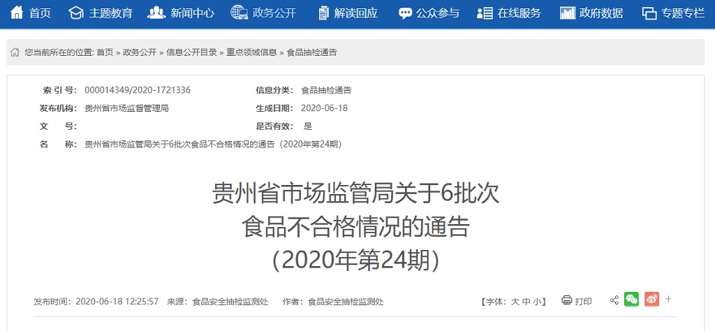 中國質(zhì)量新聞網(wǎng)訊 2020年6月18日,貴州省市場(chǎng)監(jiān)督管理局網(wǎng)站發(fā)布關(guān)于6批次食品不合格情況的通告(2020年第24期)。據(jù)通告,近期,貴州省市場(chǎng)監(jiān)督管理局組織抽檢肉制品、糕點(diǎn)、食用農(nóng)產(chǎn)品3類食品455批次樣品。根據(jù)食品安全國家標(biāo)準(zhǔn)檢驗(yàn)和判定,其中抽樣檢驗(yàn)項(xiàng)目合格樣品449批次,不合格樣品6批次。
