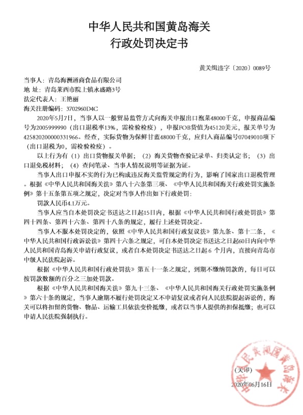 中國質(zhì)量新聞網(wǎng)訊 2020年6月22日,青島海關(guān)網(wǎng)站發(fā)布《中華人民共和國黃島海關(guān)關(guān)于青島海洲通商食品有限公司違規(guī)案的處罰決定(黃關(guān)緝違字〔2020〕0089號)》。