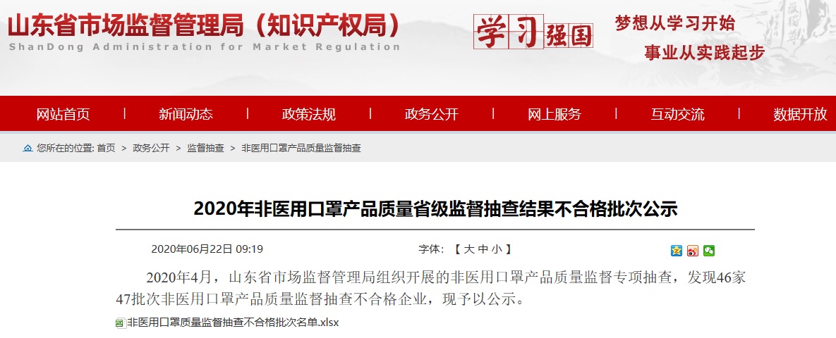 中國質(zhì)量新聞網(wǎng)訊 據(jù)山東省市場監(jiān)督管理局網(wǎng)站2020年6月22日消息,2020年4月,山東省市場監(jiān)督管理局組織開展的非醫(yī)用口罩產(chǎn)品質(zhì)量監(jiān)督專項抽查,發(fā)現(xiàn)46家企業(yè)的47批次非醫(yī)用口罩產(chǎn)品質(zhì)量監(jiān)督抽查不合格。
