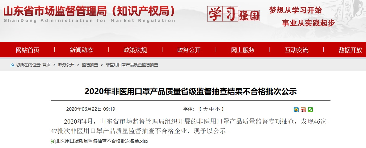 中國質(zhì)量新聞網(wǎng)訊 (廣島) 當(dāng)前口罩已經(jīng)成了我們的日常用品,但你知道嗎,你戴的口罩很可能是不合格的。6月22日,山東省市場監(jiān)督管理局網(wǎng)站公布的《2020年非醫(yī)用口罩產(chǎn)品質(zhì)量省級(jí)監(jiān)督抽查結(jié)果不合格批次公示》顯示,46家企業(yè)的47批次非醫(yī)用口罩產(chǎn)品質(zhì)量監(jiān)督抽查不合格。