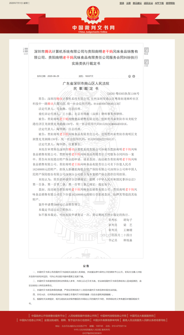 6月29日,中國裁判文書網(wǎng)發(fā)布《深圳市騰訊計算機系統(tǒng)有限公司與貴陽南明老干媽風味食品銷售有限公司、貴陽南明老干媽風味食品有限責任公司服務合同糾紛執(zhí)行實施類執(zhí)行裁定書》。