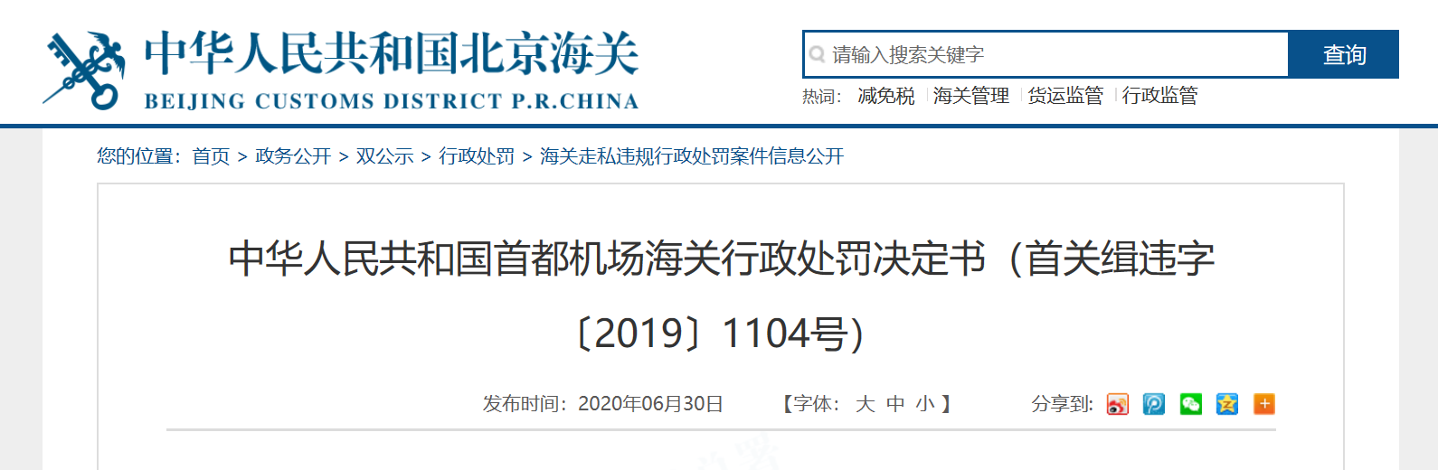 中國質(zhì)量新聞網(wǎng)訊 6月30日,北京海關(guān)官網(wǎng)發(fā)布中華人民共和國首都機(jī)場海關(guān)行政處罰決定書(首關(guān)緝違字〔2019〕1104號)。