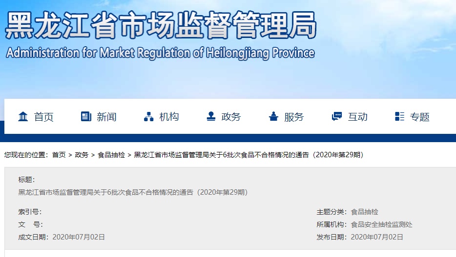 中國質(zhì)量新聞網(wǎng)訊 2020年7月2日,黑龍江省市場監(jiān)督管理局網(wǎng)站發(fā)布關(guān)于6批次食品不合格情況的通告(2020年第29期)。