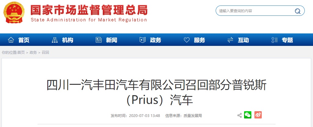中國質(zhì)量新聞網(wǎng)訊 據(jù)國家市場監(jiān)督管理總局網(wǎng)站2020年7月3日消息,日前,四川一汽豐田汽車有限公司根據(jù)《缺陷汽車產(chǎn)品召回管理條例》和《缺陷汽車產(chǎn)品召回管理條例實施辦法》的要求,授權(quán)委托四川一汽豐田汽車有限公司長春豐越公司向國家市場監(jiān)督管理總局備案了召回計劃。決定自即日起,召回 2014年2月11日至 2015年9 月25日生產(chǎn)的普銳斯(Prius)汽車,共計1,440輛。